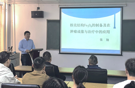 张翔博士汇报的题目为“核壳结构Fe3O4的制备及在肿瘤成像与治疗中的应用”,主要介绍了水热法合成核壳结构Fe3O4@PEG/PAM纳米粒子,并通过化学交联的方式在其表面连接肿瘤靶向分子,合成了具有肿瘤靶向能力的超顺磁性纳米分子影像探针。对纳米粒子进行了材料学、生物安全性、靶向性能的表征,并对纳米粒子的载药能力和抗肿瘤治疗效果进行了体内外评价。